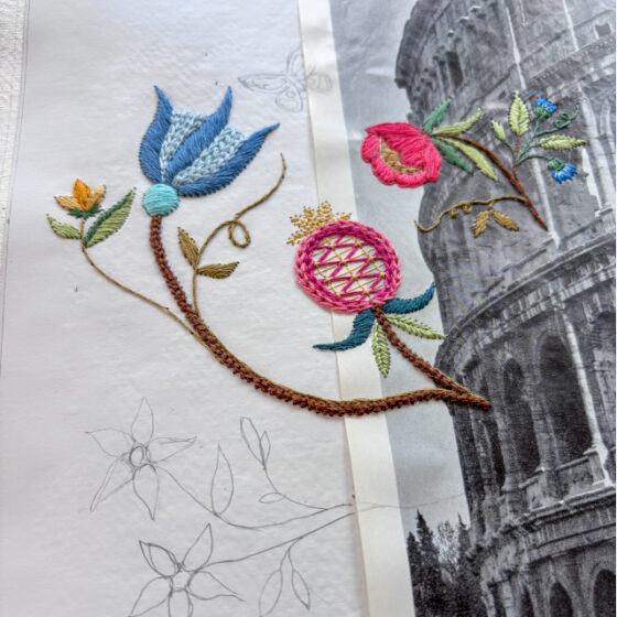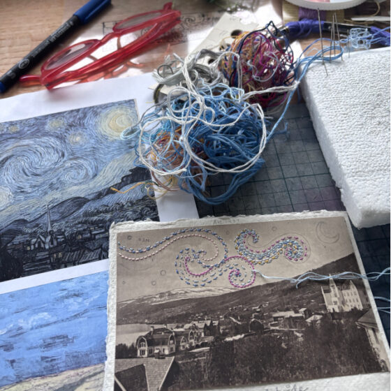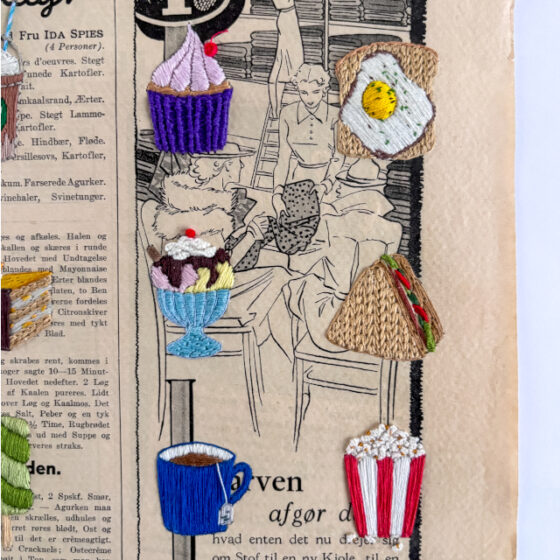 Korssting, fladsting, knudesting og frie sting er min passion. Stingene sætter jeg i historiske gamle udklip fra bøger og blade fra 30’erne, 40’erne og 50’erne. Det tager tid at brodere, og jeg elsker denne langsomhed. Med mit kunsthåndværk gør jeg op med den flygtige hverdag præget af effektivitet, hastighed og tidsoptimering. I stedet søger jeg langsomhed og fordybelse med detaljeret broderi i skønne historiske billeder fundet på lofter og i glemte skuffer.