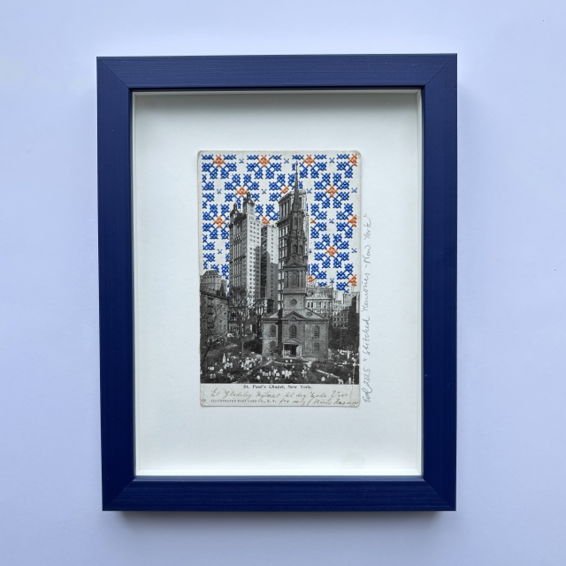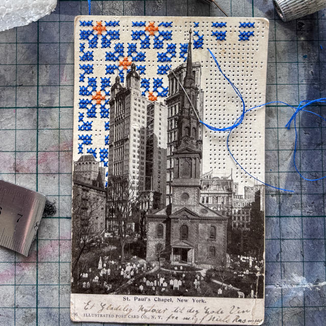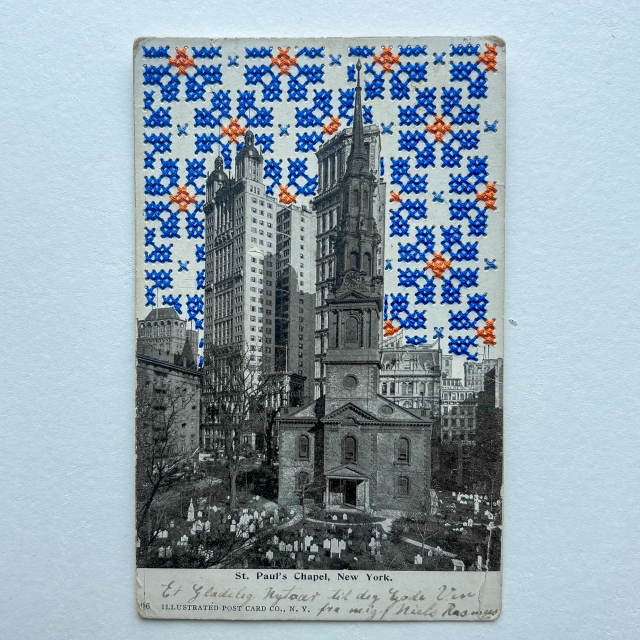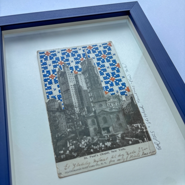 Det broderede mønster er farveafstemt og sat op med skarpe kanter på det sort/hvide foto. Papirets ujævnhed og slidte kanter er bevaret som modspil til det præcise og detaljerede broderi. Papirets skrøbelighed fornemmes.