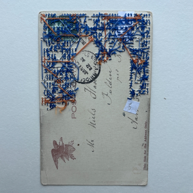 Den sirlige brodericollage er limet op på et slidt bogomslag. Den slidte gaze og de løse tråde giver modspil til det præcise broderi. Samtidig vidner bogryggen med gaze og løse tråde om bogbinderhåndværket.